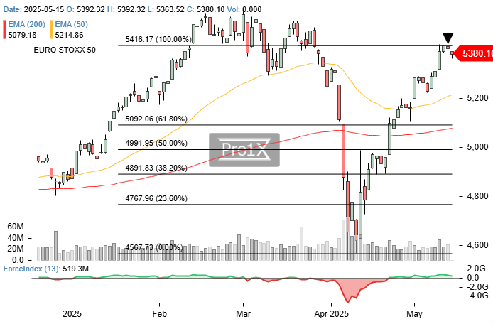 The 5.420–5.450 congestion zone—coinciding with the late-March bearish breakout gap—has, for now, arrested the spectacular up-move that began a few weeks earlier around the 4.600 level. The index is beginning to show signs of short-term weakness and trend exhaustion. The 5.200 and 5.090 marks—first short-term support and the first Fibonacci retracement (which aligns with the 200-day moving average), respectively—are now the key levels to watch. Any pullback that holds above these supports, especially the latter, would likely be interpreted as a healthy oscillator reset ahead of new highs.